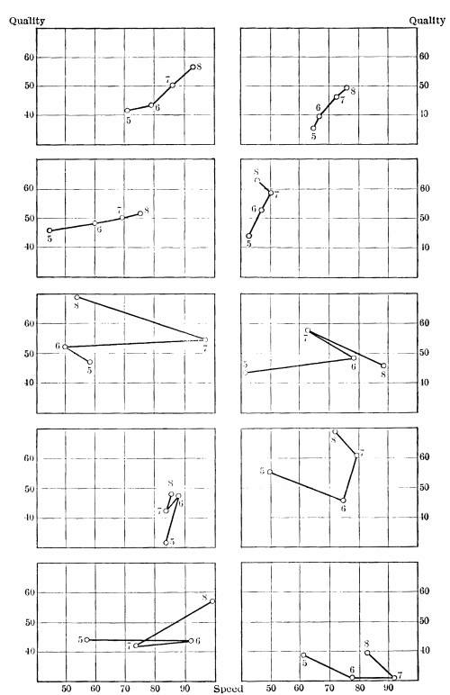 75 Quality on vertical scale, speed on horizontal scale. The four schools referred to in the text are represented in the four diagrams in the upper part of the figure. North Doan is reported in the diagram in the upper left-hand corner. Kentucky is shown in the upper right-hand corner. Memorial is under North Doan. Mt. Pleasant is under Kentucky.