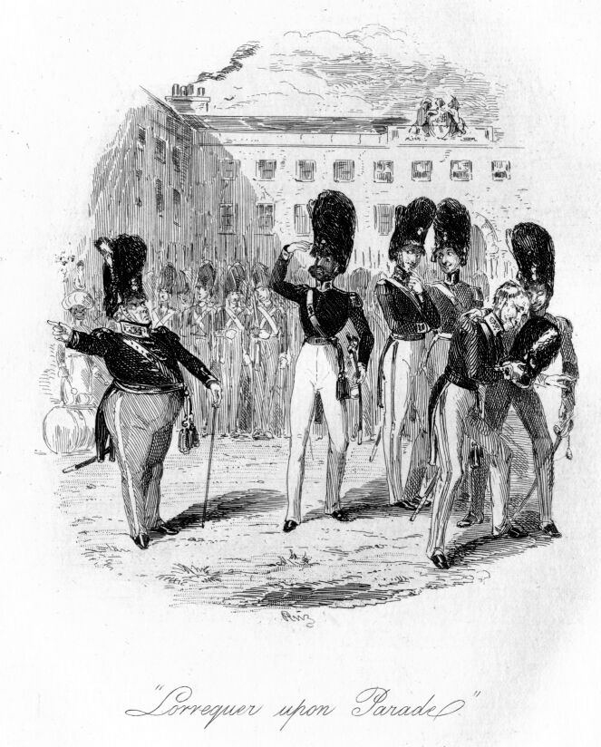 I dressed myself with the speed of lightning; but as I proceeded in my occupation—guess my annoyance to find that the toilet-table and glass, ay, and even the basin-stand, had been removed to the dressing-room of the theatre; and my servant, I suppose, following his master’s example, was too tipsy to remember to bring them back; so that I was unable to procure the luxury of cold water—for now not a moment more remained—the drum had ceased, and the men had all fallen in. Hastily drawing on my coat, I put on my shako, and buckling on my belt as dandy-like as might be, hurried down the stairs to the barrack-yard. By the time I got down, the men were all drawn up in line along the square; while the adjutant was proceeding to examine their accoutrements, &c. as he passed down. The colonel and the officers were standing in a group, but no conversing. The anger of the commanding officer appeared still to continue, and there was a dead silence maintained on both sides. To reach the spot where they stood, I had to pass along part of the line. In doing so, how shall I convey my amazement at the faces that met me—a general titter ran along the entire rank, which not even their fears for consequences seemed able to repress—for an effort, on the part of many, to stifle the laugh, only ended in a still louder burst of merriment. I looked to the far side of the yard for an explanation, but there was nothing there to account for it. I now crossed over to where the officers were standing, determining in my own mind to investigate the occurrence thoroughly, when free from the presence of the colonel, to whom any representation of ill conduct always brought a punishment far exceeding the merits of the case.