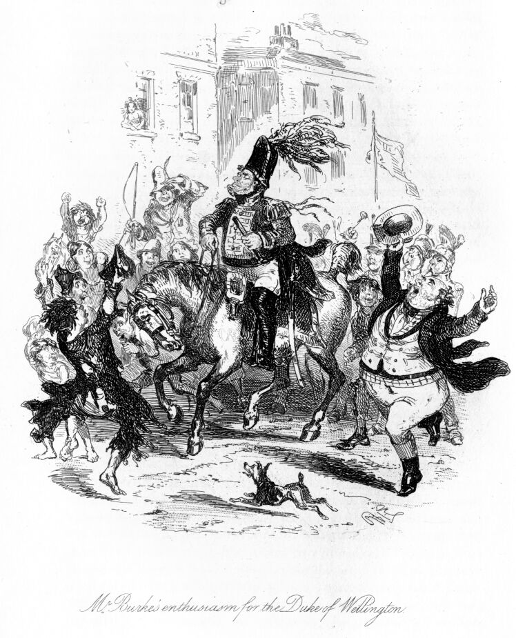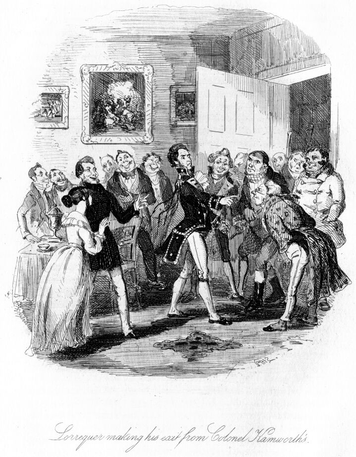 When I first returned to consciousness, I found myself lying exactly where I had fallen. Around me lay heaps of slain—the two of “ours” amongst the number. One of them—I remember he was the adjutant—held in his hand a wax candle (three to the pound). Whether he had himself seized it in the enthusiasm of my narrative of flood and field, or it had been put there by another, I know not, but he certainly cut a droll figure. The room we were in was a small one off the great saloon, and through the half open folding-door I could clearly perceive that the festivities were still continued. The crash of fiddles and French horns, and the tramp of feet, which had lost much of their elasticity since the entertainments began, rang through my ears, mingled with the sounds “down the middle,” “hands across,” “here’s your partner, Captain.” What hour of the night or morning it then was, I could not guess; but certainly the vigor of the party seemed little abated, if I might judge from the specimens before me, and the testimony of a short plethoric gentleman, who stood wiping his bald head, after conducting his partner down twenty-eight couple, and who, turning to his friend, said, “Oh, the distance is nothing, but it is the pace that kills.”