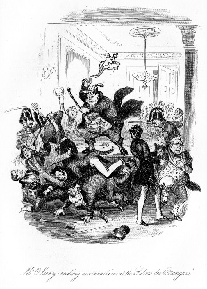At this moment I remembered I had brought with me my cane, which, from a perhaps pardonable vanity, I was fond of parading. It was a present from the officers of my regiment—many of them, alas, since dead—and had a most splendid gold head, with a stag at the top—the arms of the regiment. This I would not have lost for any consideration I can mention; and this now was gone! I looked around me on every side; I groped beneath the table; I turned the sleeping sots who lay about in no very gentle fashion; but, alas, it was gone. I sprang to my feet and only then remembered how unfit I was to follow up the search, as tables, chairs, lights, and people seemed all rocking and waving before me. However, I succeeded in making my way, through one room into another, sometimes guiding my steps along the walls; and once, as I recollect, seeking the diagonal of a room, I bisected a quadrille with such ill-directed speed, as to run foul of a Cork dandy and his partner who were just performing the “en avant:” but though I saw them lie tumbled in the dust by the shock of my encounter—for I had upset them—I still held on the even tenor of my way. In fact, I had feeling for but one loss; and, still in pursuit of my cane, I reached the hall-door. Now, be it known that the architecture of the Cork Mansion House has but one fault, but that fault is a grand one, and a strong evidence of how unsuited English architects are to provide buildings for a people whose tastes and habits they but imperfectly understand—be it known, then, that the descent from the hall-door to the street was by a flight of twelve stone steps. How I should ever get down these was now my difficulty. If Falstaff deplored “eight yards of uneven ground as being three score and ten miles a foot,” with equal truth did I feel that these twelve awful steps were worse to me than would be M’Gillicuddy Reeks in the day-light, and with a head clear from champagne.