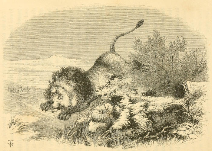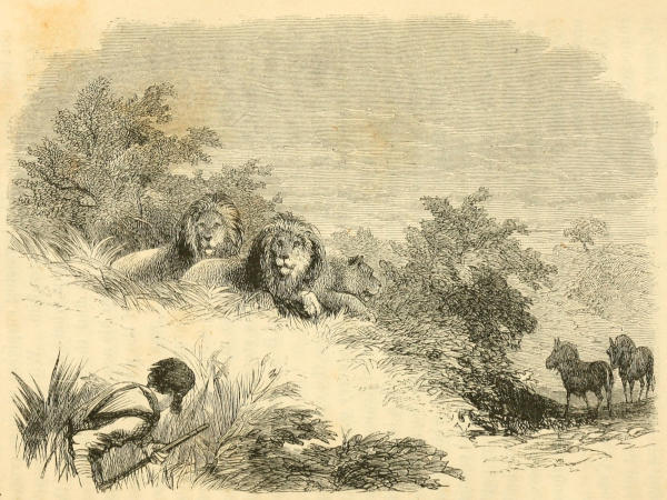 | Preparations for Journey.—Breaking-in Oxen.—Departure from Scheppmansdorf.—An infuriated Ox.—The Naarip Plain.—The scarlet Flower.—The Usab Gorge.—The Swakop River.—Tracks of Rhinoceros seen.—Anecdote of that Animal.—A Sunrise in the Tropics.—Sufferings from Heat and Thirst.—Arrival at Daviep: great resort of Lions.—A Horse and Mule killed by them.—The Author goes in pursuit.—A troop of Lions.—Unsuccessful Chase.—Mules’ flesh palatable | 44 |