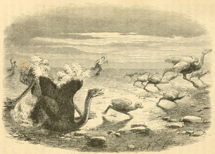 | Capture of young Ostriches.—Natural History of the Ostrich; where found; Description of; Size; Weight; Age; Voice; Strength; Speed; Food; Water; Breeding; Incubation; Cunning; Stones found in Eggs; Chicks; Flesh.—Brain in request among the Romans.—Eggs highly prized.—Uses of Egg-shells.—Feathers an article[xii] of Commerce.—Ostrich Parasols.—The Bird’s destructive Propensities.—Habits.—Resembles Quadrupeds.—Domestication.—The Chase.—Snares.—Ingenious Device.—Enemies of the Ostrich | 247 |