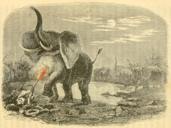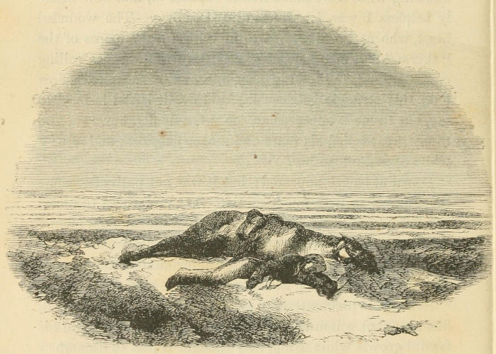 | Departure from Ghanzé.—Nectar in the Desert.—Difficulty in finding Water.—Arrive at Abeghan.—Unsuccessful Chase.—A “Charm.”—How to make the undrinkable drinkable.—An Elephant wounded and killed.—Bold and courageous Dog.—Kobis.—Author seized with a singular Malady.—Messengers dispatched to the Chief of the Lake Ngami.—A large troop of Elephants.—Author kills a huge Male.—Lions and Giraffe.—Author’s hair-breadth Escapes: from a black Rhinoceros; from a white Rhinoceros; from two troops of Elephants; he shoots a couple of his Adversaries.—Where to aim at an Elephant | 386 |