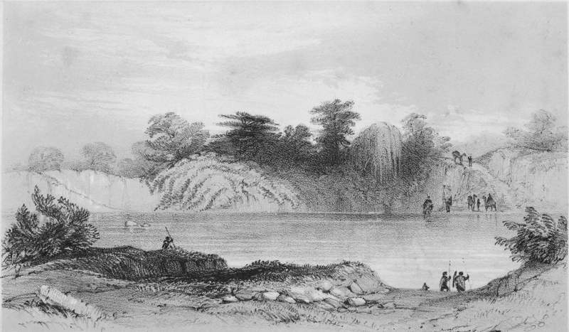 We sat waiting for the camels above an hour, which I occupied in taking a good survey of the 458little reach before us, and in getting some information relative to the general character and course of the river. Its channel is a mere cut, or canal about fifteen feet deep and thirty yards broad, in the alluvial plane which extends some miles on either side. The water itself, at this period of the year, was only from two to three feet in depth; and in many places, large stones showed their summits above the surface. A fringe of various kinds of trees hung over from the banks on either side, and each extremity of that portion of the river I saw, seemed to be lost among their drooping, dark green foliage.