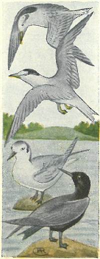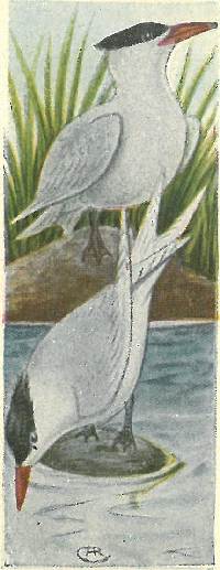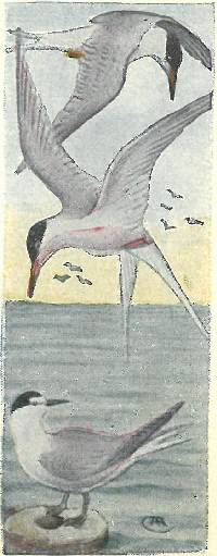 These birds are slender and graceful in form and flight, but are the real pirates of bird life, especially among the terns and gulls. This species has two color phases regardless of sex or age. In the light plumage the top of the head is black, rest of the bird brownish. Easily identified by the lengthened central tail-feathers.