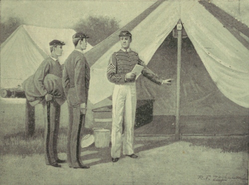 And with such friends at his back, what young soldier would not feel pride and hope and confidence? Then came the close of the examination, the announcement of class standing; and Geordie had clambered out of the twenties and well up into the teens, standing second in drill regulations (as they are called to-day), third in discipline, well up in drawing, though still in middle sections in the philosophical and chemical courses. Ames was easily head, Benton third, Ross fourth, and Connell fifth. And then came the order to move into camp, and our Geordie found himself, with his second lieutenant for mate, occupying the north end tent of the company officers' row—the tent which, three years before, bucket laden, and with shoulders braced and head erect, he had passed and repassed so many times, never dreaming he should become so thoroughly and easily at home within the white walls, into whose depth it was then profanation to gaze.