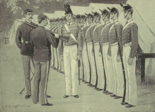May, with its sunshine and showers and long languorous days—"the days of spring fever and spring fights," as the cadets used to say—found the relations between Geordie and his company more and more cordial. All through the year, with absolute impartiality and quiet force, he had done his duty to the best of his ability, and Connell, with all his pride in "old D," was the last to claim for it a superiority over the color company. Bend declared he never had to bother his [269]head about it at all. He marched it out to parade or inspection, but his first sergeant looked to the discipline. Among the officers of the tactical department, too, there was no lack of appreciation of the way in which "McCrea's plebe" had won his way up the ladder of promotion, and the relative position of the cadet officers for the coming summer was already a problem over which the corps was indulging in much speculation and the commandant in no little thought. The two finest positions, as has been said, are those of first captain and adjutant. The former commands the battalion in the mess-hall and on its way to and from the same, while the latter has the most conspicuous part to play at parade, guard-mounting, and the like. The first captain is assigned to the right flank, Company A, and his responsibilities are great. He requires dignity and strength of character beyond the other officers. The adjutant should be a model in bearing, carriage, voice, command, but his duties are more picturesque than formidable. As a rule, these high offices—the captaincies, adjutancy, etc.—are given to cadets whose scholarship and class standing are also high; for in the greater number of cases soldierly ability and character are there to be found. Yet it often happens that the head of the First Class is only a private in the ranks, and the senior captain or [270]the adjutant comes from the other end of the line. When graduation is close at hand, however, the commandant makes out a list of the recommendations for the coming year, and this he submits to the superintendent. His wishes generally carry all possible weight.