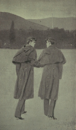 January examinations passed by without material change in the standing of those in whom we are most interested, except in the case of Benny Frazier—too ill to appear before the Board. For weeks he had been "running down," and the assault at the hands of Jennings proved but the climax that brought on a violent and dangerous siege of fever. For days the devoted mother, aided by skilled nurses, was ever at the side of her stricken boy. Volunteers from his class, too, were always in readiness as night-watchers; but almost from the first the one for whom he called and of whom he moaned in his delirium was Geordie Graham. No one saw the meeting between the heart-sick, almost hopeless woman and her son's earliest friend and room-mate, but that she had been deeply agitated was plain. From their interview she came forth clinging to his arm, leaning on his strength, and from that time she was never content to have him far away. Each day, between retreat parade and evening call to quarters, there were hours he could spend at Frazier's bedside, and they were the only [259]hours in all the twenty-four that the feeble, childlike patient looked forward to with anything but apathy. For days his life hung in the balance; but when at last the crisis came and went and left him pitiably weak in body and spirit, the one thing he seemed to cling to in life was Graham's brown and muscular hand.