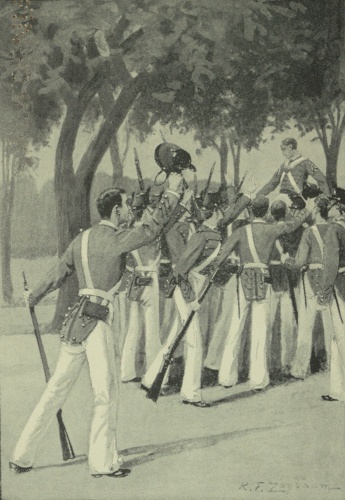 Drums and fifes burst instantly into the liveliest quickstep. Eight beautiful fronts, each pivoting on its left, accurate and steady as sections of some perfect machine, came swinging around into column. "Forward, march! Guide right!" and then, "Column half right!" as the leading subdivision completed the wheel. And now away they go over the level Plain, heading for the leaf-embowered gap between the chapel and the old Academic, each subdivision led by its lieutenant commanding, Connell, Ross, and Winn marching as field officers on the guiding flank, Geordie commanding all. Group after group of the gayly-dressed visitors opened out to let them through. The sword arms of the young captains brush close to dainty girlish forms those very arms have encircled in the dance, and pretty faces are smiling into the eyes of those swarthy, sunburned young warriors in whom it would be "unmilitary" to show sign of recognition now. The head of the column reaches the cross-road at the foot of the Plain, and, "Column half left!" Geordie's voice rings out across the level and comes echoing back from the gray walls beyond, and the groups of spectators fall farther back—all but one which, escorted by Colonel Hazzard and Dr. [285]Brett, stands at the edge of the road at the pathway just under the beautiful elms. A lady with soft blue eyes is clinging to the colonel's arm and trembling, despite her every effort. Close beside her stands a grizzled, weather-beaten, soldierly-looking man in tweeds, one hand on the shoulder of a ruddy-faced young fellow who is evidently in high excitement. Just back of them Mrs. Frazier, her dark eyes brimming, is resting on the arm of Dr. Brett. Company after company comes up to the wheeling-point and changes direction almost in front of them, and then, his eyes fixed on his leading guide to see that each sergeant in succession gets his trace the instant the wheel is completed, here comes the brawny, blue-eyed first captain. These returning furlough-men are apt to be a trifle careless in marching, and he means to bring them into shape without an instant's delay. He seems to see nothing outside his command, but when within a dozen yards suddenly he catches sight of the uniforms and of his colonel. Instantly, as soldierly etiquette demands, the blue eyes are fixed on the commanding officer; up comes the gleaming blade in the first motion of the salute, and then—-then—what wondrous light is that that all on a sudden flames—transfigures the brave, sun-tanned face? What wild amaze, doubt, certainty, delight, all in a single second, flash into his eyes! What pride and joy! what love and longing! For there, so close [286]that he can almost hear the whisper of his name and feel the spray of the joy-tears that brim in her eyes, stands mother; there stands Buddie, fairly quivering with eagerness; and there stands his father, sturdily striving not to look proud. With every mad longing tugging at his heart and tearing him from his duty to her arms, he as suddenly regains his self-control, lowers his sword in salute, as soldier should, and only quits his grasp upon the hilt and leaps to her side at the colonel's smiling order: