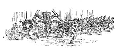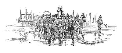 Into the area doorway of a neighboring dwelling, with faces of gloom, they had led their wounded comrade. Sympathizing, kind-hearted women bathed his forehead and smoothly bandaged it, even as the uproar without increased, and companies from far down-town kept pouring into the crowded street. By this time half a dozen streams were on the blaze and the black smoke had turned to white steam, but still they came, Gulick and Guardian, hose and engine, from under the Jefferson tower, and natty 55 Hose,—the "Harry Howards,"—from away over near the Christopher ferry, and their[34] swell rivals of 38, from Amity Street, close at the heels of Niagara 4, with her handsome Philadelphia double-deck engine, and "3 Truck," from Fireman's Hall, in Mercer Street, and another big double-decker, 11, from away down below the Metropolitan Hotel, raced every inch of the mile run up Broadway by her east side rival, Marion 9. Fancy the hundreds of shouting, struggling, excited men blocking Lexington Avenue and Eighteenth Street for two hundred yards in every direction from what we would call to-day a "two-hundred-dollar fire," and you can form an idea of the waste of time, money, material, and energy, the access of uproar, confusion, and, ofttimes, rowdyism, that accompanied an alarm in the days before the war. Remember that all this, too, might result from the mere burning out of a chimney or the ignition of a curtain in a garret window, and you can readily see why tax-payers, thinking men, and insurance companies finally decided that the old volunteer department must be abolished.