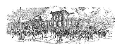 Yes, out from Broadway, as he spoke, a little swarm of men and boys on the drag-ropes, another company came, hauling a bulky little red hand-engine, and went tugging in chase of the lighter hook and ladder. A minute's swift run brought the youngsters to the open square, another around to the broad space in front of the Everett, and there the misty atmosphere grew heavy and thick, and the swarm of scurrying men and boys breathed harder as they plunged into a dense drift of smoke. Just as our youngsters noted that the crowds were running eastward through Nineteenth Street, the old rallying cry of another company was heard, and a light hose carriage came bounding across the car-tracks from the direction of Broadway. Snipe by this time was a dozen yards ahead, and could not hear or would not heed the half-choking, warning cry of puffing little Shorty.
