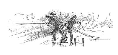 Too late! Half a dozen young fellows were sprinting along beside their pet hose carriage. No more were needed on the ropes, and as Shorty rounded the corner[30] into Nineteenth Street and saw the flames bursting from the roof of a stable close to Lexington Avenue, he saw, too, with bursting heart, three of those young flankers spring up on the sidewalk in chase of long-limbed Snipe, saw one of them overtake him, lay sudden hand on his shoulder on one side and hurl him violently to the left, just in time to be tripped over the tangling foot of another and tumbled headlong into the reeking gutter, there to lie, stunned and almost senseless, till Shorty, raging, yet breathless and helpless, strove to lift his bleeding head upon his knee.