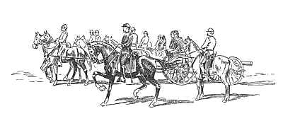 "Still," said the major, in telling of it later, "we could not realize we were badly whipped. We knew we must have punished them as hard as we were punished, all but the mishandling, perhaps, of those batteries, and all that seemed necessary was to fall back on the heights of Centreville and there stand our ground." But instead of going thither by the direct route along the pike, which would have held the commands together, through some further mischance the brigades, left finally to shift for themselves, drifted back the way they came, and this led to the further disaster to the north of Bull Run. No sooner had the retiring troops "uncovered" the stone bridge than Confederate guns and cavalry pushed forward, and one well-handled battery found a position from which it could easily command that suspension bridge over Cub Run, some two miles farther east. And then the fun began in earnest—for the rebs. That bridge was the sole means of escape of all Union batteries and a whole menagerie of draught animals, wagons, ambulances, and even buggies and carriages of sightseers from Washington, all surging back that way. A shell exploding on the bridge killed and wounded the mules of a heavy wagon, which was instantly overturned, completely blocking the passage for other wheels.[285] More shells burst about the ears of the now demoralized drivers and teamsters, who cut their traces, mounted their animals, and rode madly away. As darkness fell gradually upon the scene, a dozen more splendid guns and several dozen wagon-loads of stores and supplies were left, and among the abandoned vehicles was the ambulance conveying the wounded major, watched over by faithful Snipe and Sergeant Keating.