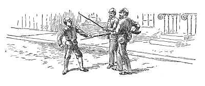 The desk, littered with its books and papers, stood in the corner between the window and the east wall. Along the west wall was a curtained clothes-press. Then came the marble-topped washstand, into which the water would flow only at night, when the demand for Gotham's supply of Croton measurably subsided. Beyond that was the door leading to the open passage toward the stairway to the lower floors. In the corner of the room were the school-boy paraphernalia of the day,—a cricket bat, very much battered, two base-ball bats that the boys of this generation would doubtless scan suspiciously, "heft" cautiously, then discard disdainfully, for they were of light willow and bigger at the bulge by full an inch than the present regulation. Beneath them in the corner lay the ball of the year 1860, very like the article now in use, but then referred to as a "ten shilling," and invariably made at an old shoe-shop at the foot of Second Avenue, whose owner, a veteran cobbler, had wisely quit half-soling and heeling for a sixpence and was coining dollars at the newly discovered trade. All the leading clubs were then his patrons,—the Atlantics, the Eckfords, the Mutuals, the Stars, even the Unions of Morrisania. All the leading junior clubs swore by him and would use no ball but his,—the champion Actives, the Alerts, the Uncas. (A "shanghai club" the boys[14] declared the last named to be when it first appeared at Hamilton Square in its natty uniform of snow-white flannel shirts and sky-blue trousers.) Base ball was in its infancy, perhaps, but what a lusty infant and how pervading! Beyond that corner and hanging midway on the northward wall was a portentous object, an old-fashioned maple shell snare-drum, with white buff leather sling and two pairs of ebony sticks, their polished heads and handles proclaiming constant use, and the marble surface of the washstand top, both sides, gave proof that when practice on the sheepskin batter head was tabooed by the household and the neighborhood, the inoffensive stone received the storm of "drags," and "flams," and "rolls." Lifting the curtain that overhung the boyish outfit of clothing, there stood revealed still further evidence of the martial tastes of the occupant, for the first items in sight were a natty scarlet shell-jacket, a pair of trim blue trousers, with broad stripe of buff, and a jaunty little forage-cap, with regimental wreath and number. Underneath the curtain, but readily hauled into view, were found screwed and bolted to heavy blocks of wood two strange-looking miniature cannon, made, as one could soon determine, by sawing off a brace of old-fashioned army muskets about a foot from the breech. Two powder-flasks and a shot-bag hung on pegs at the side of the curtained clothes-press. A little mirror was clamped to the wall above the washstand. Some old fencing foils and a weather-beaten umbrella stood[15] against the desk. An open paint-box, much besmeared, lay among the books. Some other pamphlets and magazines were stacked up on the top of the clothes-press. Two or three colored prints, one of Columbian Engine, No. 14, a very handsome Philadelphia "double-decker." Another of Ringgold Hose, No. 7, a really beautiful four-wheeler of the old, old type, with chocolate-colored running gear and a dazzling plate-glass reel, completed the ornamentation of this school-boy den. There was no room for a lounge,—there was room only for two chairs; but that diminutive apartment was one of the most popular places of resort Pop's boys seemed to know, and thereby it became the hot-bed of more mischief, the birthplace of more side-splitting school pranks than even the staid denizens of that most respectable brownstone front ever dreamed of, whatever may have been the convictions of the neighborhood, for Pop's boys, be it known, had no dormitory or school-house in common. No such luck! They lived all over Manhattan Island, all over Kings, Queens, and Westchester counties. They came from the wilds of Hoboken and the heights of Bergen. They dwelt in massive brownstone fronts on Fifth Avenue and in modest wooden, one-story cottages at Fort Washington. They wore "swell" garments in some cases and shabby in others. They were sons of statesmen, capitalists, lawyers, doctors, and small shopkeepers. They were rich and they were poor; they were high and they were low, tall and short, skinny and stout, but they[16] were all pitched, neck and crop, into Pop's hopper, treated share and share alike, and ground and polished and prodded or praised, and a more stand-on-your-own-bottom lot of young vessels ("vessels of wrath," said the congregation of a neighboring tabernacle) never had poured into them impartially the treasures of the spring of knowledge. They were of four classes, known as the first, second, third, and fourth Latin, corresponding to the four classes of Columbia and other colleges, and to be a first Latin boy at Pop's was second only to being a senior at Yale or Columbia. As a rule the youngsters "started fair" together at the bottom, and knew each other to the backbone by the time they reached the top. Few new boys came in except each September with the fourth Latin. Pop had his own way of teaching, and the boy that didn't know his methods and had not mastered his "copious notes" might know anybody else's Cæsar, Sallust, or Cicero by rote, but he couldn't know Latin. Pop had a pronunciation of the Roman tongue that only a Pop's bred boy could thoroughly appreciate. Lads who came, as come in some rare cases they did, from Eton or Harrow, from the Latin schools of Boston or the manifold academies of the East, read as they had been taught to read, and were rewarded with a fine sarcasm and the information that they had much to unlearn. Pop's school was encompassed roundabout by many another school, whose pupils took their airing under ushers' eyes, to the howling disdain of Pop's unhampered pupils,[17] who lined the opposite curb and dealt loudly in satiri