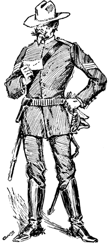 Long years afterward, riding one evening into a cavalry camp on the Southern plains, Captain Cross and the writer noted a tall, blue-eyed, bronzed-cheeked[201] trooper, whose twirling mustache was almost the color of the faded yellow of the chevrons on his sleeve. Despite dust and the rough prairie dress, no finer soldier had met their eyes in the long column that went flitting by.