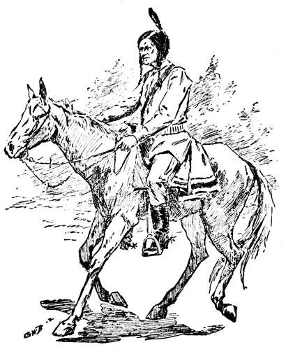 At last, after another hour of anxiety, he determined to slip away westward, go up the Rawhide a few miles until he could gain the shelter of some low-lying ridges, crossing the stream, and making a wide circuit, sweep around to the Platte. He might still reach it before dark and find a ford, or at least a place to swim across; he could trust "Big Jim" for that. But even as he would have put this plan in execution, he saw to his dismay a new move among the warriors. Four little dots came riding from the timber[145] and pushing back up the valley. These were only the advance. In half an hour the whole band came jogging leisurely out of the shadows, and little dots farther east came streaking across the flats to join them. Fred saw that the whole war party was now retracing its steps and coming back upstream, and that now, if he waited, he might pursue his original intention of crossing at the shallows, ten miles below the mouth of the Rawhide. And so, patiently and pluckily, he kept his ground,—"Big Jim" contentedly filling himself with buffalo grass the while,—and not until the sun was low in the west did Fred realize their real intent. Just as the scouts, far in advance of the[146] main party, reached the winding banks of the Rawhide, they seemed to hold brief consultation; one of them plunged through to the western side, the other three turned and came straight toward the watching boy.