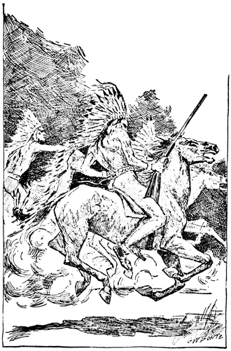 All too late! A sudden flashing signal from the leader, and all at an instant with trailing feathers, with war cry and the thunder of a hundred hoofs, the painted band has whirled across the ridge in front and is down in the dip beyond. Every Indian has vanished from his view and whirled into sight of the victims on the crest beyond.