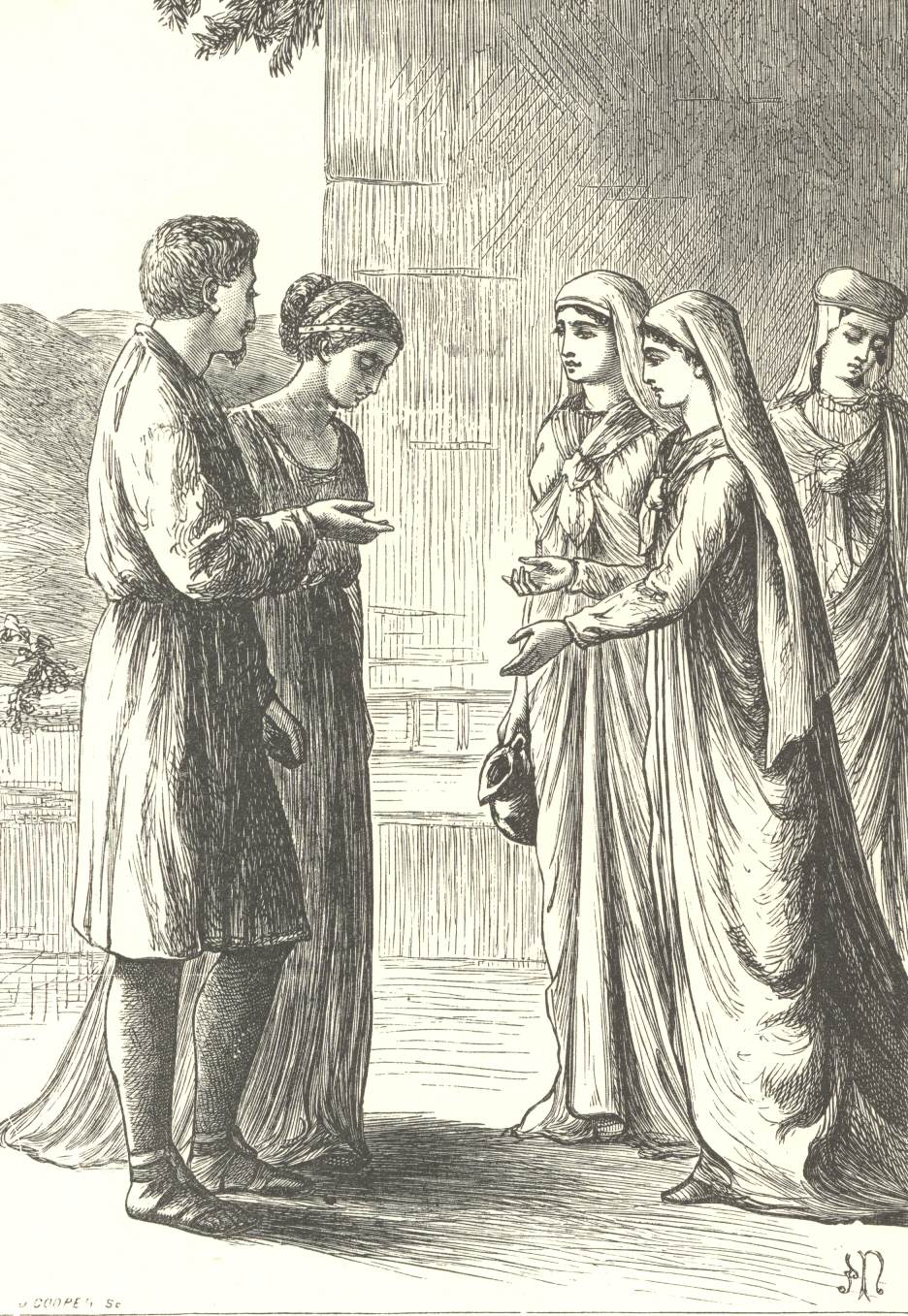 “In the fifth year of the reign of King Henry II. after the conquest of England by William, duke of Normandy, the Lord of Uglebardby, then called William de Bruce, and the Lord of Sneton, called Ralph de Perci, with a gentleman and a freeholder called Allatson, did on the 16th day of October appoint to meet and hunt the wild boar, in a certain wood or desert place belonging to the abbot of the monastery of Whitby; the place’s name is Eskdale-side; the abbot’s name was Sedman. Then these gentlemen being met, with their hounds and boar-staves, in the place before-named, and there having found a great wild boar, the hounds ran him well near about the chapel and hermitage of Eskdale-side, where was a monk of Whitby, who was a hermit. The boar being very sore, and very hotly pursued, and dead run, took in at the chapel door, and there died: whereupon the hermit shut the hounds out of the chapel, and kept himself within at his meditations and prayers, the hounds standing at bay without. The gentlemen in the thick of the wood, being put behind their game, followed the cry of their hounds, and so came to the hermitage, calling on the hermit, who opened the door and came forth, and within they found the boar lying dead, for which the gentlemen in very great fury (because their hounds were put from their game) did most violently and cruelly run at the hermit with their boar-staves, whereby he died soon after: thereupon the gentlemen, perceiving and knowing that they were in peril of death, took sanctuary at Scarborough. But at that time the abbot, being in very great favour with King Henry, removed them out of the sanctuary, whereby they came in danger of the law, and not to be privileged, but likely to have the severity of the law, which was death. But the hermit, being a holy and devout man, at the point of death sent for the abbot, and desired him to send for the gentlemen who had wounded him: the abbot so doing, the gentlemen came, and the hermit, being very sick and weak, said unto them, ‘I am sure to die of those wounds you have given me.’ The abbot answered, ‘They shall as surely die for the same;’ but the hermit answered, ‘Not so, for I will freely forgive them my death, if they will be contented to be enjoined this penance for the safeguard of their souls.’ The gentlemen being present, and terrified with the fear of death, bade him enjoin what penance he would, so that he would but save their lives. Then said the hermit, ‘You and yours shall hold your lands of the Abbot of Whitby and his successors in this manner: That upon Ascension Eve, you or some of you shall come to the woods of the Strag Heads, which is in Eskdale-side, the same day at sun-rising, and there shall the abbot’s officer blow his horn, to the intent that you may know how to find him; and he shall deliver unto you, William de Bruce, ten stakes, eleven strut-towers, and eleven yethers, to be cut by you or some for you, with a knife of one penny price; and you, Ralph de Perci, shall take twenty and one of each sort, to be cut in the same manner; and you, Allatson, shall take nine of each sort, to be cut as aforesaid, and to be taken on your backs, and carried to the town of Whitby, and to be there before nine of the clock the same day before-mentioned; at the same hour of nine of the clock (if it be full sea) your labour or service shall cease; but if it be not full sea, each of you shall set your stakes at the brim, each stake one yard from the other, and so yether them on each side of your yethers, and so stake on each side with your strut-towers, that they may stand three tides without removing by the force thereof: each of you shall do, make, and execute the said service at that very hour every year, except it shall be full sea at that hour: but when it shall so fall out, this service shall cease. You shall faithfully do this in remembrance that you did most cruelly slay me; and that you may the better call to God for mercy, repent unfeignedly for your sins, and do good works, the officers of Eskdale-side shall blow, Out on you, out on you, out on you, for this heinous crime. If you or your successors shall refuse this service, so long as it shall not be full sea at the aforesaid hour, you or yours shall forfeit your lands to the Abbot of Whitby, or his successors. This I intreat, and earnestly beg that you may have lives and goods preserved for this service; and I request of you to promise by your parts in heaven that it shall be done by you and your successors, as it is aforesaid requested, and I will confirm it by the faith of an honest man.’ Then the hermit said: ‘My soul longeth for the Lord, and I do as freely forgive these men my death as Christ forgave the thieves upon the cross;’ and in the presence of the abbot and the rest he said, moreover, these words: ‘Into thy hands, O Lord, I commend my spirit, for from the bonds of death Thou hast redeemed me, O Lord of truth. Amen.’ So he yielded up the ghost the eighth day of December, A.D. 1160, upon whose soul God have mercy. Amen.”