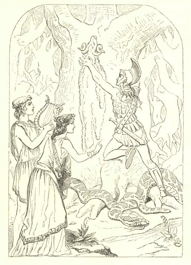 Fifteen years were past and gone, and the babe was now grown to be a tall lad and a sailor, and went many voyages after merchandise to the islands round. His mother called him Perseus; but all the people in Seriphos said that he was not the son of mortal man, and called him the son of Zeus, the king of the Immortals. For though he was but fifteen, he was taller by a head than any man in the island; and he was the most skilful of all in running and wrestling and boxing, and in throwing the quoit and the javelin, and in rowing with the oar, and in playing on the harp, and in all which befits a man. And he was brave and truthful, gentle and courteous, for good old Dictys had trained him well; and well it was for Perseus that he had done so. For now Danae and her son fell into great danger, and Perseus had need of all his wit to defend his mother and himself.