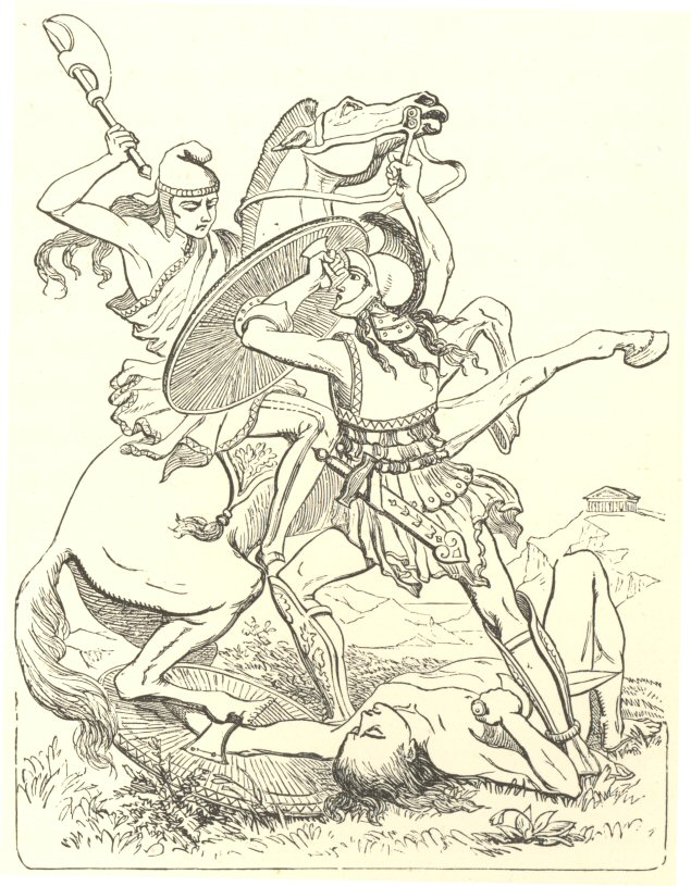 For he killed the bull of Marathon, which had killed Androgeos, Minos’ son; and he drove back the famous Amazons, the warlike women of the East, when they came from Asia, and conquered all Hellas, and broke into Athens itself. But Theseus stopped them there, and conquered them, and took Hippolute their queen to be his wife. Then he went out to fight against the Lapithai, and Peirithoos their famous king: but when the two heroes came face to face they loved each other, and embraced, and became noble friends; so that the friendship of Theseus and Peirithoos is a proverb even now. And he gathered (so the Athenians say) all the boroughs of the land together, and knit them into one strong people, while before they were all parted and weak: and many another wise thing he did, so that his people honoured him after he was dead, for many a hundred years, as the father of their freedom and their laws. And six hundred years after his death, in the famous fight at Marathon, men said that they saw the ghost of Theseus, with his mighty brazen club, fighting in the van of battle against the invading Persians, for the country which he loved. And twenty years after Marathon his bones (they say) were found in Scuros, an isle beyond the sea; and they were bigger than the bones of mortal man. So the Athenians brought them home in triumph; and all the people came out to welcome them; and they built over them a noble temple, and adorned it with sculptures and paintings in which we are told all the noble deeds of Theseus, and the Centaurs, and the Lapithai, and the Amazons; and the ruins of it are standing still.