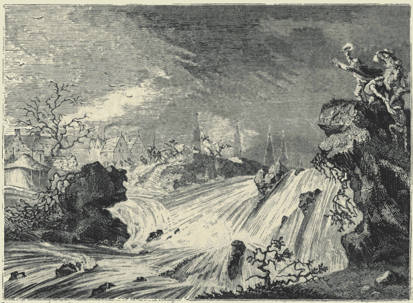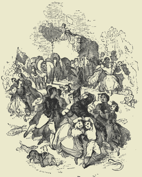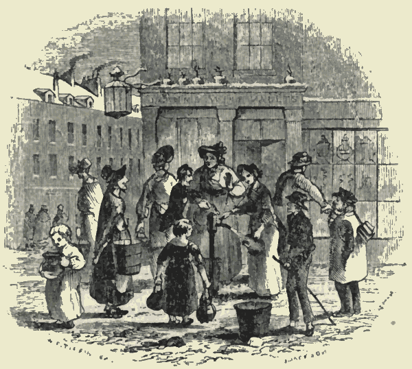 [Pg 409]A curious parallel might be carried out between the itinerant occupations which the progress of society has imperfectly suspended, and those which even the most advanced civilization is compelled to retain. For example,—the water-carrier is gone. It is impossible that London can ever again see a man bent beneath the weight of a yoke and two enormous pails, vociferating "New River Water." But the cry of "Milk," or the rattle of the milk-pail, will never cease to be heard in our streets. There can be no reservoirs of milk, no pipes through which it flows into the houses. The more extensive the great capital becomes, the more active must be the individual exertion to carry about this article of food. The old cry was, "Any milk here?" and it was sometimes mingled with the sound of "Fresh cheese and cream;" and it then passed into "Milk, maids, below;" and it was then shortened into "Milk below;" and was finally corrupted into "Mio," which some wag interpreted into mi-eau—demi-eau—half-water. But it must still be cried, whatever be the cry. The supply of milk to the metropolis is perhaps one of the most beautiful combinations of industry we have. The days are long since past when Finsbury had its pleasant groves, and Clerkenwell was a village, and there were green pastures in Holborn, and St. Pancras boasted only a little church standing in meadows, and St. Martin's was literally in the fields. Slowly but surely does the baked clay stride over the clover and the buttercup; and yet every family in London may be supplied with milk by eight o'clock every morning at their own doors. Where do the cows abide? They are congregated in wondrous masses in the suburbs; and though in spring-time they go out to pasture in the fields which lie under the Hampstead and Highgate hills, or in the vales of Dulwich and Sydenham, and there crop the tender blade,