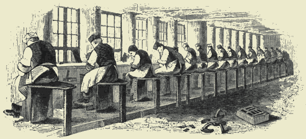 The small number of "artisans and handicrafts," comprising only sixty thousand families, is of itself a sufficient [Pg 388]indication that our manufactures, properly so called, were of very trifling amount. In various parts of this volume we have incidentally mentioned how slowly the great industries of this country grew into importance. At the period of which we are now speaking, nearly every article of clothing was, in many districts, of domestic production, and was essentially connected with the tillage of the land. The flax and the wool were spun at home; the stockings were knit; the shoes were often untanned hide nailed upon heavy clogs. Furniture there was little beyond the rough bench and the straw bed. The fuel came from the woods and hedges. About forty thousand of the cottages mentioned in the hearth-books had some land belonging to them; and, to prevent the growth of a "squatter" population, it was the business of the Grand Jury to present, as a nuisance, all newly-erected cottages that had not four acres of land attached to them. There was a contest perpetually going on between the more favoured portion who had regular means of subsistence, and the unhappy many who were pressing upon those means, in all the various forms of pauperism. One of the means of keeping down this class was to prevent them having dwellings.