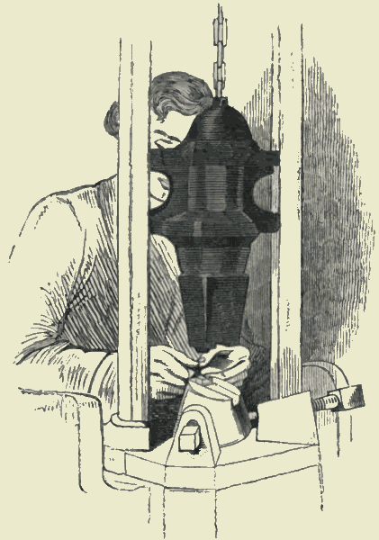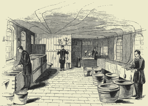 In striking contrast to the various forms of unskilled labour and irregular trading which we have noticed, may be mentioned an industry which in London has a very perfect organization. In Clerkenwell and the neighbouring parish of Saint Luke's, there are sixteen hundred watchmakers. These are not the artisans whom we see as we pass along the streets of the metropolis, and of the provincial towns, sitting in front of the shop-window diligently repairing or putting together the works of a watch, by the light of day or of a brilliant lamp, each with a magnifying glass pressed under his eyebrow. Nor are they the workers in metal who manufacture the movements,—that is, the wheels—of a watch, for these chiefly dwell in Lancashire. The London watchmakers, thus closely packed in a district which is small compared with the whole area of the metropolis, are those who put the movements together, and supply all the delicate parts of the mechanism, such as the spring and the escapement. They provide also[Pg 414] the case and the dial-plate. The degree of the skilled labour employed in these several branches necessarily varies, according to the quality of the instrument to be produced, from the ordinary metal watch to the most luxurious repeater. With some exceptions, the artisans do not work in large factories. They are subdivided according to their respective qualities, amongst small establishments, where a master has several men receiving wages for performing one particular branch of work; or the artisan himself, in his own home, may be an escapement-maker, a spring-maker, a fusee-maker, a maker of hands, an enameller, an engine-turner, a jewelled pivot-hole maker. All this beautiful subdivision of employments has been found necessary for the perfection and the cheapness of watches. The capitalist, who is essentially the watch manufacturer, organizes all these departments of industry. English watches, by this economical system of production, keep their place against the competition of foreign watches; of which we imported, in 1853, fifty-four thousand. The skilled workmen, in all the various subdivisions of the manufacture, are well paid, and take their due rank amongst the great and increasing body of intelligent mechanics.