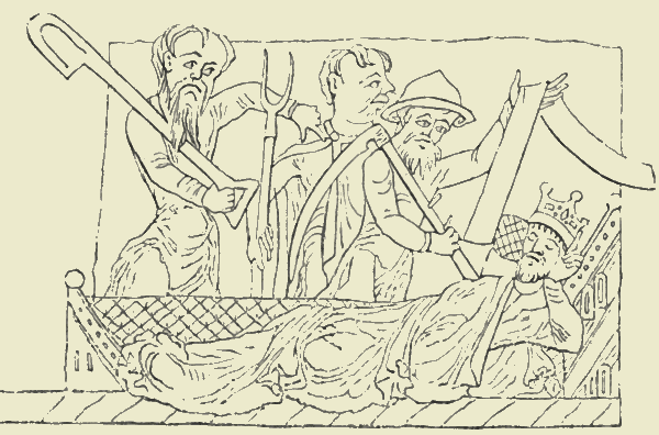 The old chroniclers relate that our Norman king, Henry I., had once a terrible vision, of soldiers, and priests, and peasants, surrounding his bed, one band succeeding another, and threatening to kill him. The legend became the subject of illuminated drawings in an ancient MS. preserved at Oxford, and one of these represented the tillers of the land, with spade, and fork, and scythe, demanding justice. The cultivators were loaded with heavy exactions, so great that the tenants of the crown even offered to give up their ploughs to the king. They ploughed, but they reaped not themselves.[Pg 382] In such a state of things there could be no accumulation, and no profitable labour. The funds for supplying the wages of labour were exhausted. The country was depopulated.