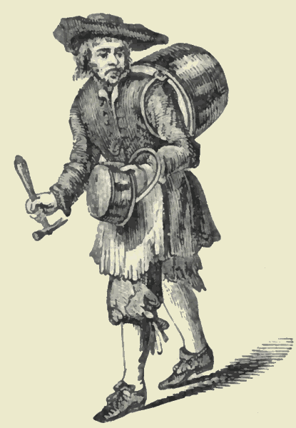Of the street trades that are past and forgotten, the small-coal man was one of the most remarkable. He tells a tale of a city with few fires; for who could now imagine a man earning a living by bawling "Small coals" from door to door, without any supply but that in the sack which he carries on his shoulders? His cry was, however, a rival with "Wood to cleave." In a metropolis full of haberdashers, large and small, what chance would an aged man now have with his flattering solicitation of "Pretty pins, pretty women?" He who carries a barrel on his back, with a measure and funnel at his side, bawling "Fine writing-ink," is wanted neither by clerks nor authors. There is a grocer's shop at every turn; and who therefore needs him who salutes us with "Lily-white vinegar?" The history of "cries" is a[Pg 411] history of social changes. The working trades, as well as the venders of things that can be bought in every street, are now banished from our thoroughfares. "Old chairs to mend" still salutes us in some retired suburb; and we still see the knife-grinder's wheel; but who vociferates "Any work for John Cooper?" or "A brass pot or an iron pot to mend?" The trades are gone to those who pay scot and lot.