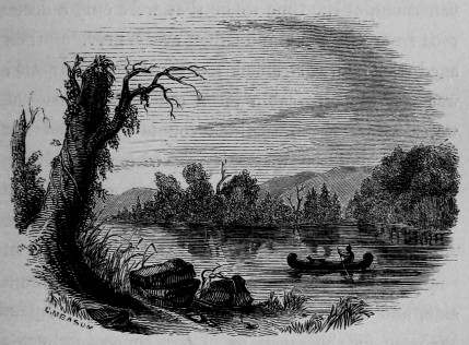 In this portion of Maine every variety of forest game may be found, but the principal kinds are the grey wolf, the black bear, the deer, and the moose. Winter is the appropriate season for their capture, when they afford a deal of sport to the hunter, and furnish a variety of food to the forest labourers. Deer are so very plentiful, that a certain resident told me, that, in the deep snow of last winter, he caught some dozen of them alive, and having cut a slit in their ears, let them go, that they might recount to their kindred their marvellous escape. But the homeliest animal, the most abundant, and the best 283 for eating, is the moose. I did not kill one, but spent a night with an old hunter who did. During the warm summer nights these animals, for the purpose of getting clear of the black-fly, are in the habit of taking to the water, where, with nothing but their heads in sight, they remain for hours. It was the evening of one of those cloudless nights, whose memory can never die. We were alone far up the Moose River, and it seemed to me, “we were the first that ever burst into that forest sea.” Embarked on board a swan-like canoe, and with our rifles ready, we carefully and silently descended the stream. How can I describe the lovely pictures that we passed? Now we peered into a dark recess in the centre of a group of elms, where unnumbered fire-flies were revelling in joy;—and now a solitary duck shot out into the stream from its hidden home, behind a fallen and decayed tree; now we watched the stars mirrored in the sleeping waves, and now we listened to the hoot of the owl, the drum of the partridge, the song of a distant waterfall, or the leap of a robber-trout. It was not far from midnight when my companion whispered, “Hush, hush!” and pointed to a dim spot some hundred yards below. The first chance was allotted me, so I took the best aim I could, and fired. I heard the ball skip along the water, and on coming near, found 284 my mark to be only a smooth rock. Two hours more passed on, one small moose was killed, and at day-break we were in our cabin fast asleep.