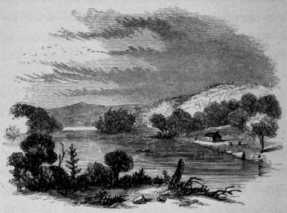Having crept along at snail’s pace about one mile, we concluded to land, and, if possible, obtain a place to sleep, and something to eat; for not having had a regular dinner, and not a mouthful of supper, we 304 were half starved. With clubs in our hands, to keep off hobgoblins and bull dogs, we wended our way towards a neighbouring farm-house, where we knocked for admittance. Pretty soon a great gawky-looking head stuck itself out of an upper window, to which we made known our heartfelt desires, receiving in return the following answer: “My wife is sick—hain’t got any bread—you can go in the barn to sleep if you want to;” and we turned reluctantly away, troubled with a feeling very nearly allied to anger. “Come, let’s go off in this direction,” exclaimed one of the party, “and I’ll introduce you to my old friend, Captain Somebody;”—and away we posted, two by two, across a new-mown field. Presently our two leaders were awe-stricken by the sudden appearance of something white, which seemed to be rising out of the earth beside a cluster of bushes, and the way they wheeled about and put for the river, (accompanied by their fellows, whose fright was merely sympathetic,) was “a caution” to all unbelievers in ghosts and other midnight spectres.