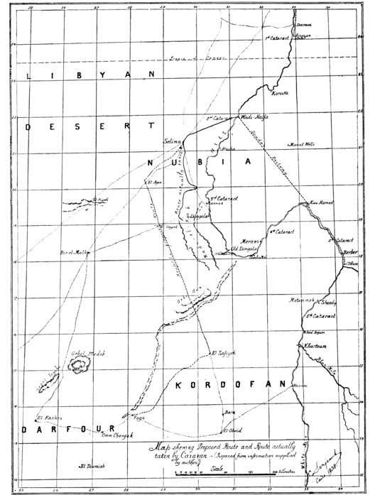 Extracts from newspaper and official accounts—The antecedents of the guide Gabou—Dissensions in the Kabbabish tribe—Gabou schemes for his own section—Hassan’s part in the matter—Gabou reveals the plot to Nejoumi and enlists Hogal on his side—The Emirs prepare to intercept me—Capture of the caravan—Hogal’s deceit and its excuse . . . 53–63