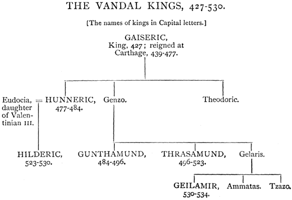 Hunneric was a tyrant of the worst type. His dealings with his family are a sufficient proof of his character. Gaiseric, to avoid the danger of a minority—a contingency which would have been fatal to his precarious monarchy—had prescribed that each Vandal king should be succeeded, not by his next-of-kin, but by his eldest relative. Such successions were very usual among the Teutonic tribes, though they had never before been formally made into a rule. Now Hunneric had a grown-up son, Hildecat, whom he destined for his successor; but the prince was, of course, younger than the king’s own brothers. Instead of cancelling his father’s law, Hunneric set to work to exterminate his brothers, and slew them with all their children, save two youths, the sons of his next brother, Genzo, who saved themselves by timely flight.