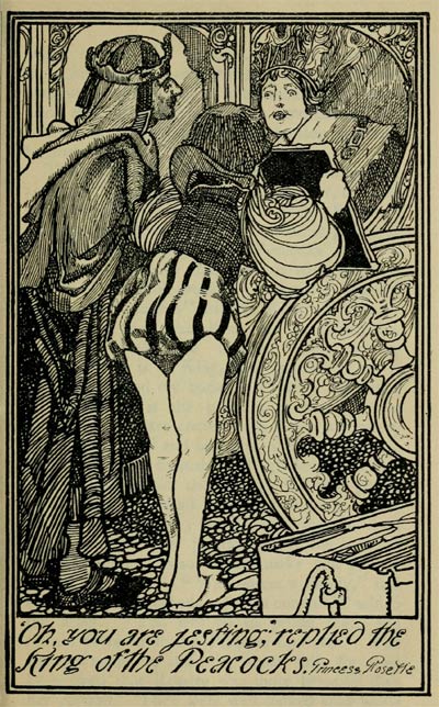 The King said to his brother "If the King of the Peacocks is a peacock himself, how can our sister marry him? it would be folly to consent to such a thing, and it would be a fine thing for us to have little peacocks for nephews." The Prince was equally disturbed at the thought. "It is an unhappy fancy she has taken into her head," he said. "I cannot think what led her to imagine that there was such a person in the world as the King of the Peacocks."