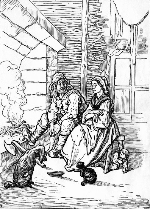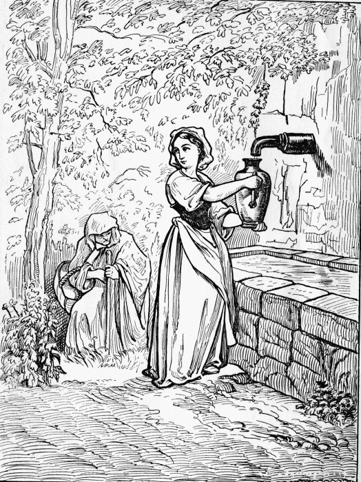 Among other things, this unfortunate child had to go twice a day to draw water more than a mile and a half from the house, and bring home a pitcherful of it. One day, as she was at this fountain, there came to her a poor woman, who begged of her to let her drink.