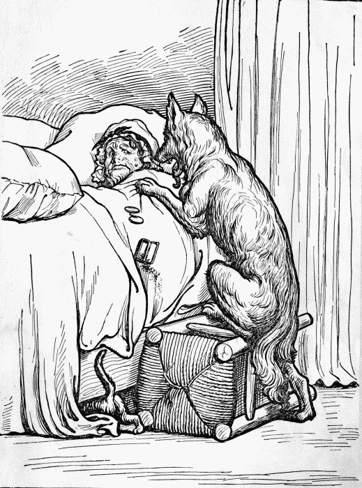 As she was going through the wood, she met Gaffer Wolf, who had a very great mind to eat her up; but he dared not, because of some fagot-makers hard by in the forest. He asked her whither she was going. The poor child, who did not know that it was dangerous to stay and hear a wolf talk, said to him:—