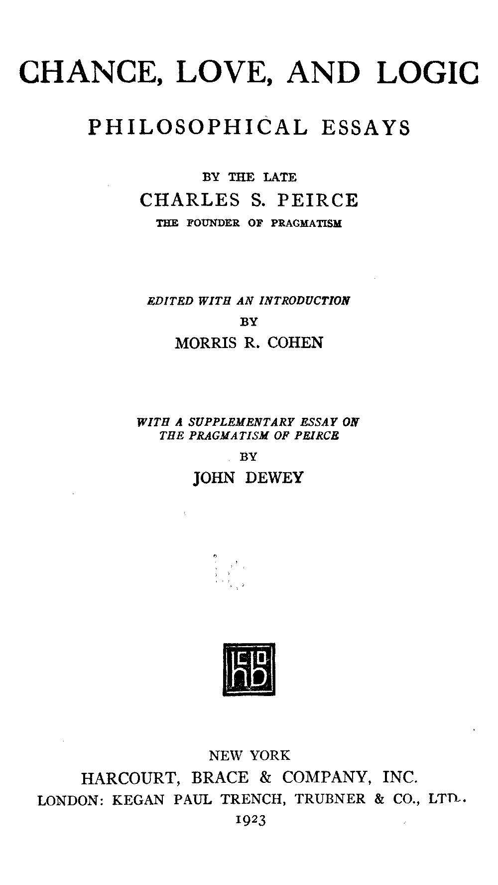 I must also acknowledge my obligation to Professor Dewey for kind permission to reprint his essay on the Pragmatism of Peirce from the Journal of Philosophy, and to the editors of that Journal, Professors Woodbridge and Bush, for permission to reprint some material of my own. Part V of the Bibliography was compiled by Mr. Irving Smith.