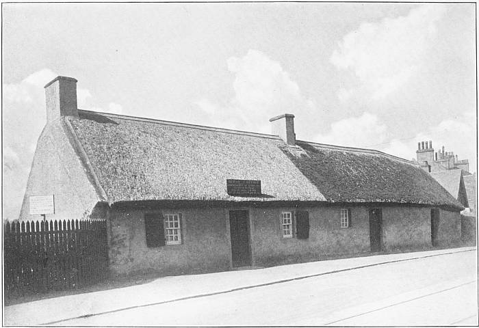 | In Ayrshire, Scotland. The poet was born here January 25, 1759. The left of the building is the cottage of two rooms where the family lived. Adjoining, on the right, is the “byre,” or cow-house. | |