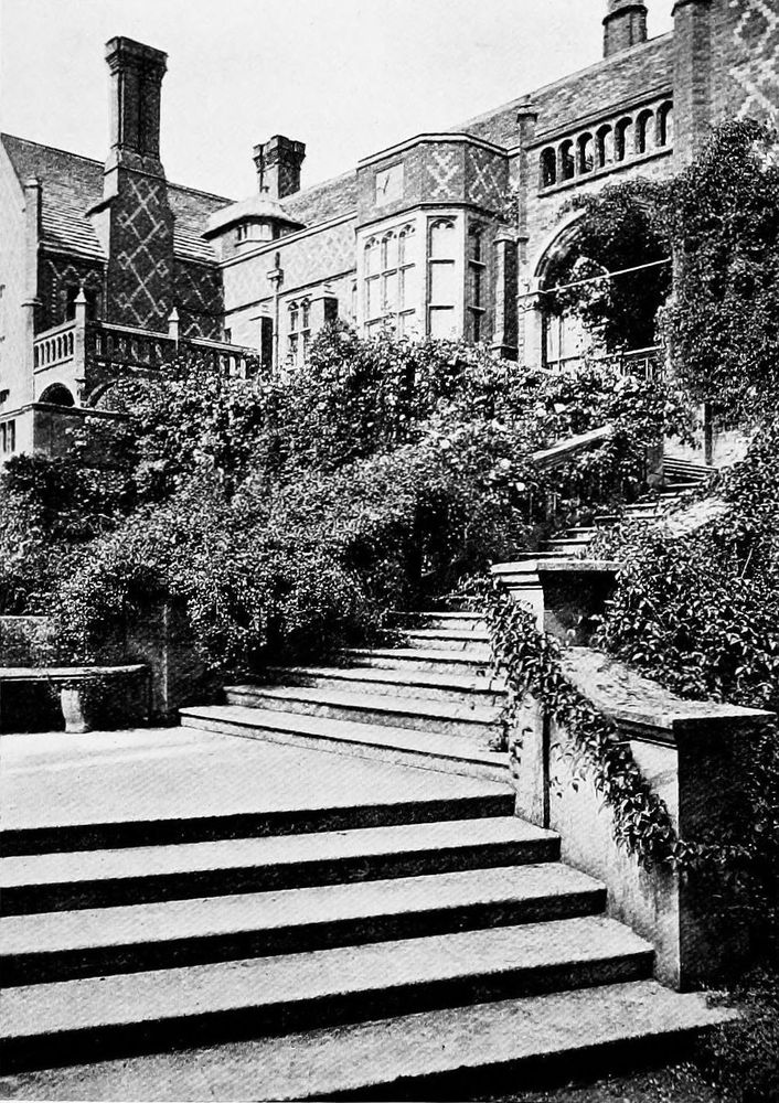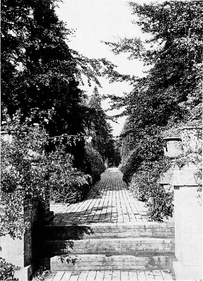 The formal garden, as it existed in the days before its modern substitute cast a slur on the word “formality,” reflected no small credit on the skill and taste of its originators. There was a sense of breadth and stateliness about it which is sadly lacking in its modern rival. Especially praiseworthy were the open stretches of turf, and bold grouping of trees, which were characteristic of the time. The planting of avenues, to whose beauty many of our older houses owe so much, the alleys and greens bounded with hedges of clipped yew, and the wide borders filled with herbaceous flowers, were all pleasing in spite of their stiffness. Aided by handsome terraces, used only where needed, as at Haddon and other places, these old time gardens were free from any suggestion of trickery or deception. Their designers were men whose ideas, if a trifle austere, were perfectly honest; they liked their handiwork to display its beauties in a straightforward manner, with the consequence that their gardens were well-proportioned, and clearly betokened that money had been ungrudgingly[5] spent where necessary. The modern formal garden is of quite another stamp, with its flimsily-constructed terraces, its ill-designed vases and statuary. There is a certain straining after effect noticeable, and a lack of dignity displayed, which makes this latter a very feeble imitation of its prototype. How can a modern villa be expected to act as a suitable foil to a style of garden design which is a cheap adaptation of that practised at Versailles or Chatsworth?