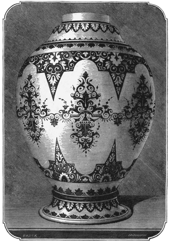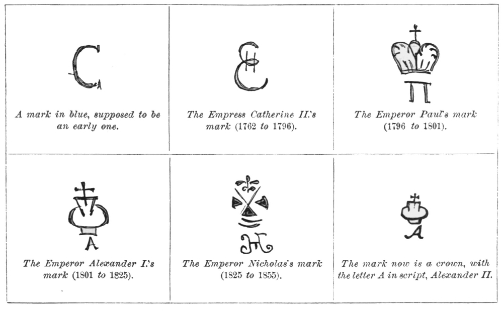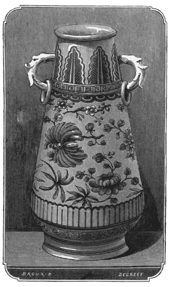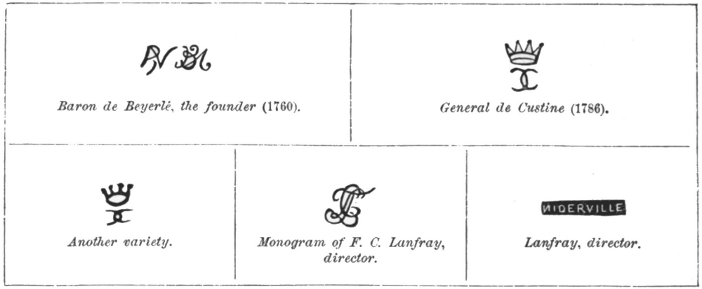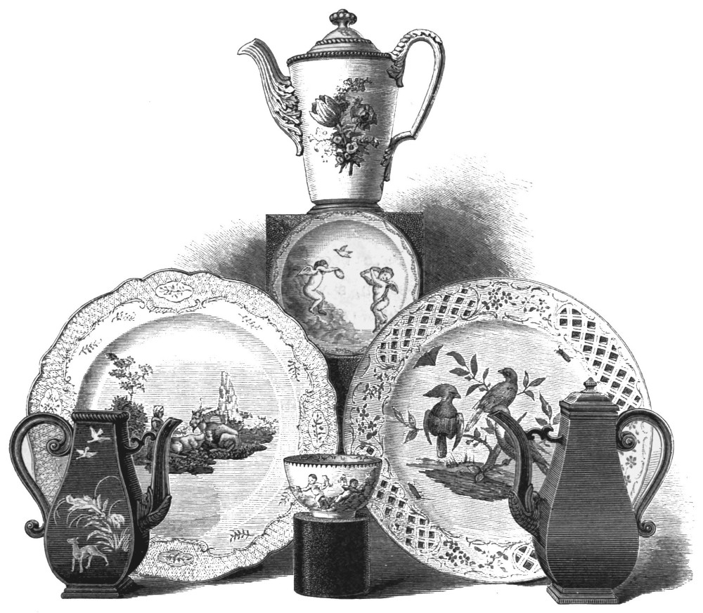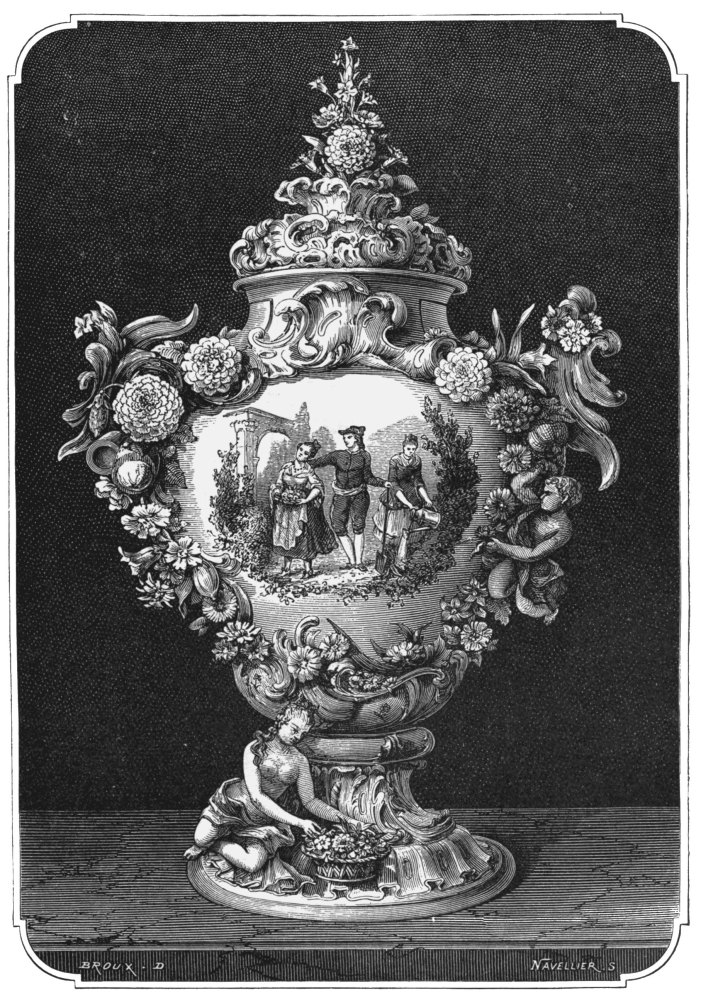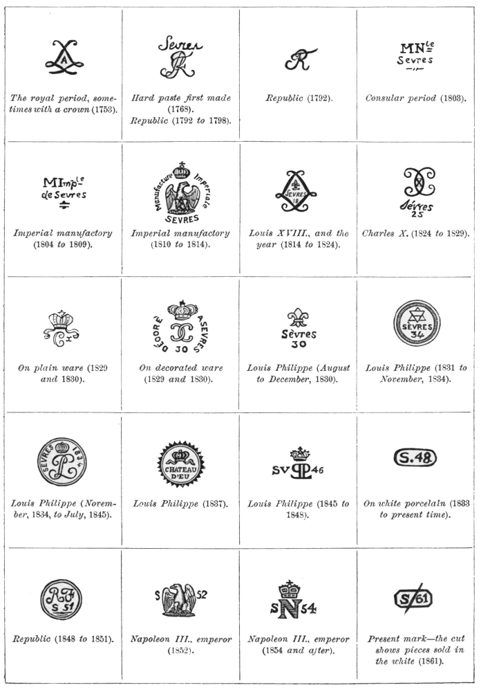 Hard and Soft Porcelain.—Discovery of Kaolin.—St.-Cloud.—Pâte Tendre.—Marks.—Rouen.—Small Manufactories.—Marks of same.—Chantilly.—Scéaux-Penthièvre.—Niderviller.—Marks.—Limoges.—Sèvres.—Flower-Work.—Hard Porcelain, Pâte Dure.—The Grand Monarque.—Florid Taste.—Boucher.—Vieux Sèvres.—Three Vases.—Greek Vases.—Prices at Bernal Sale.—Chemists.—Colors used.—Collections.—Art Museums.—Alexandra Brongniart.—Marks and Dates | 253{12} |