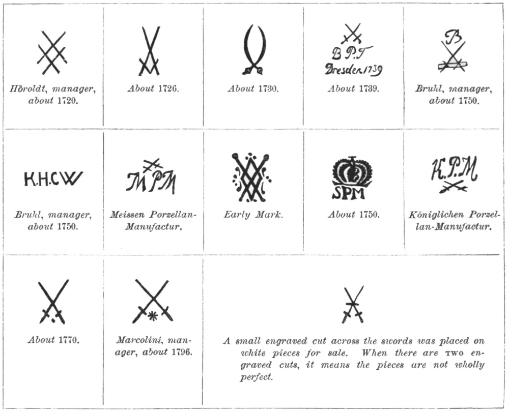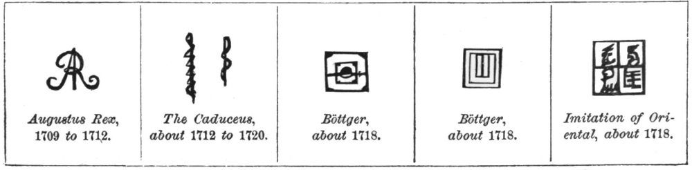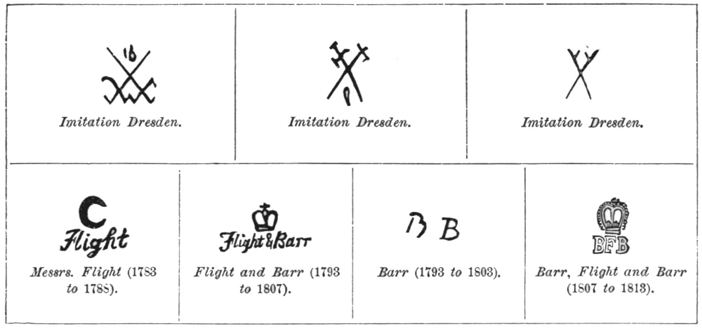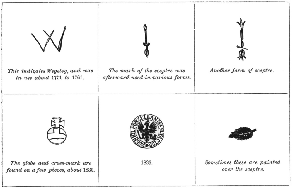 Dresden China.—Porcelain in Europe.—The Alchemists.—Augustus II.—Böttger.—Tschirnhaus.—Experiments.—Kaolin discovered.—Höroldt and Kändler.—Fine Art, or Decorative Art.—Lindenir.—Angelica Kauffmann.—Rococo-Work.—Collectors.—Marcolini.—Prices.—Marks.—Berlin.—The Seven Years’ War.—Frederick the Great.—Prices.—Marks.—Vienna.—Stenzel.—Maria Theresa.—Lamprecht.—Prices.—Marks.—Hungary.—Herend.—Fischer.—Marks.—Höchst, or Mayence.—Ringler.—Marks.—Frankenthal, or Bavarian.—Carl Theodor.—Melchior.—Prices.—Marks.—Fürstenburg, or Brunswick.—Von Lang.—Prices.—Marks.—Nymphenburg.—Heintzmann and Lindemann.—Prices.—Marks.—Ludwigsburg, or Kronenburg.—Fulda.—Hesse-Cassel.—Switzerland.—Marks | |