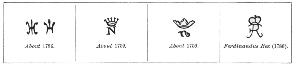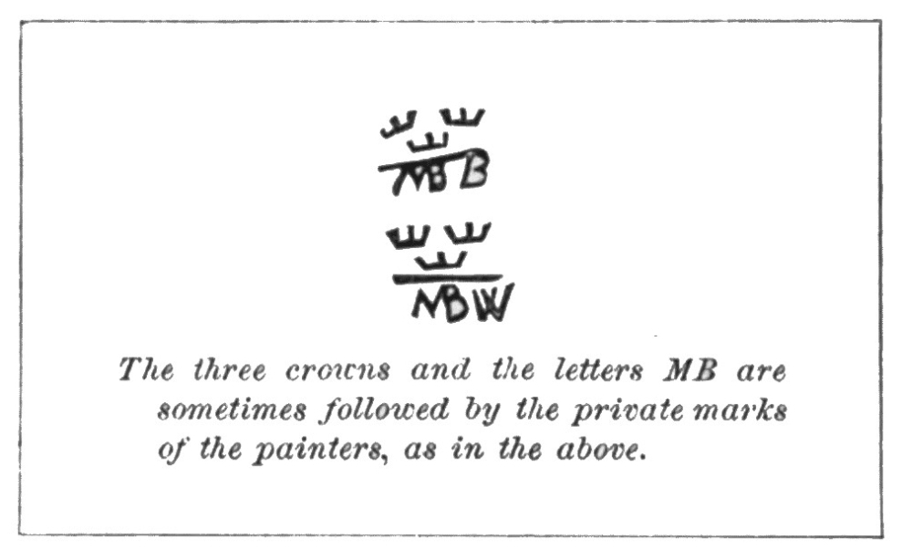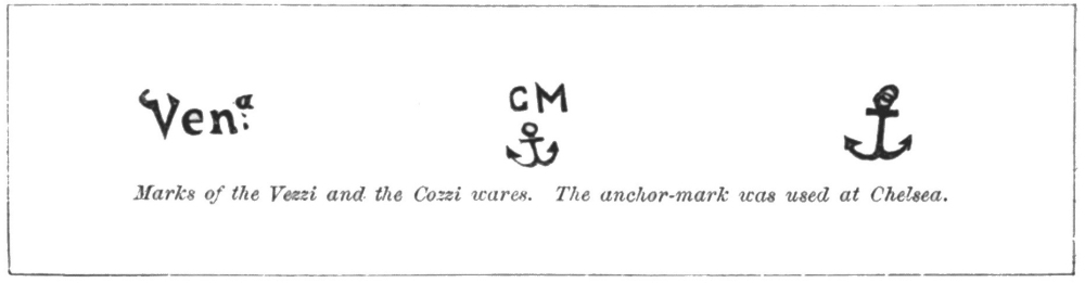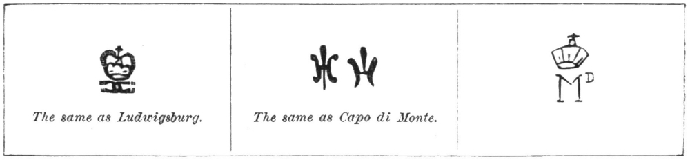 Florentine, or Medicean.—Is it a True Porcelain?—The House of Medici.—Marks.—Doccia Porcelain.—The Marquis Ginori.—Beccheroni.—Present Work.—Marks.—Venice.—Vezzi.—Cozzi.—Marks.—Turin.—Gioanetti.—Marks.—Nove.—Terraglia.—Marks.—Capo di Monte.—Naples.—In Relief.—Marks.—Spanish Porcelain.—Buen Retiro.—Marks.—Portugal | |