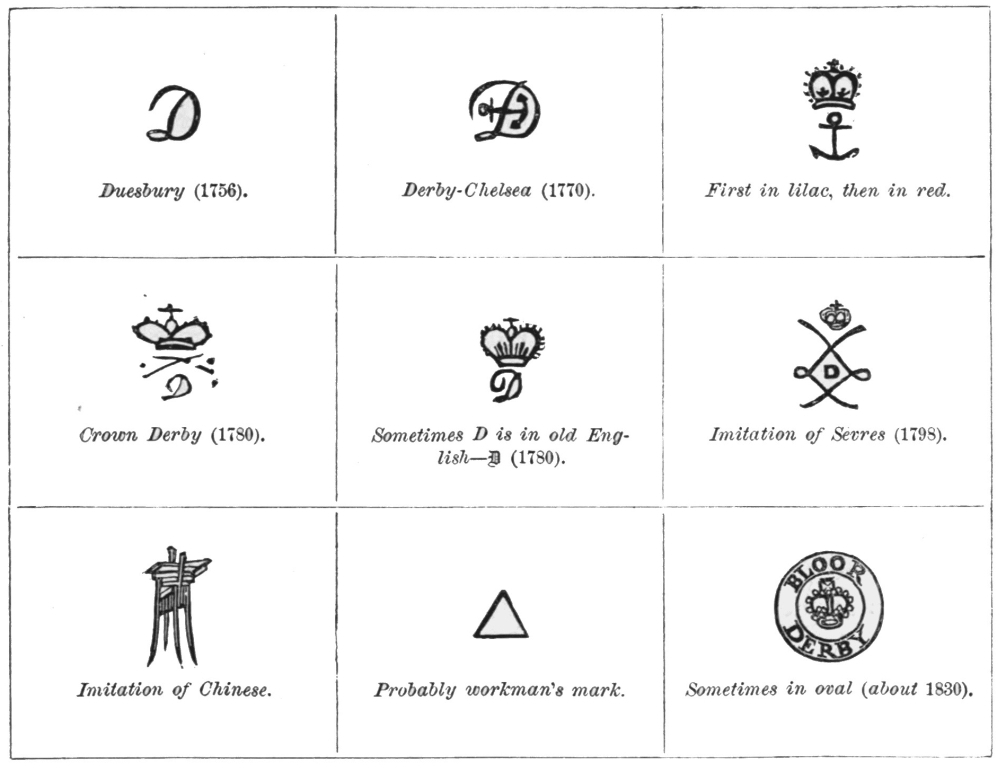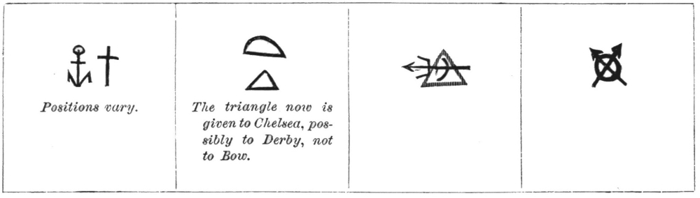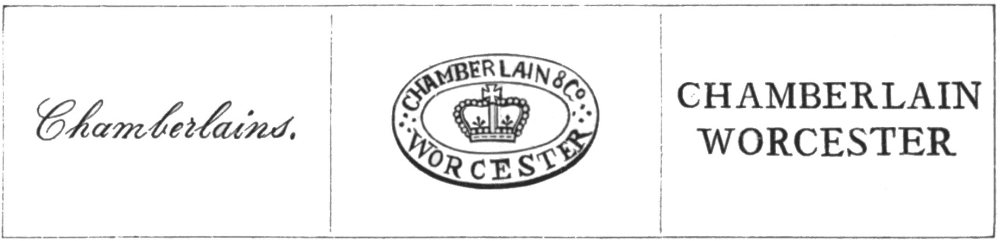 Bow.—Chelsea.—Derby.—Chelsea-Derby.—Lowestoft.—Worcester.—Chamberlains.—Plymouth.—Bristol.—Pinxton.—Nantgaraw.—Swansea.—Turners.—Coalport.—Coalbrookdale.—Herculaneum.—Shelton, New Hall.—Rockingham.—Spode, Copeland.—Place.—Daniell.—Minton.—Prices and Marks | |