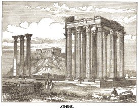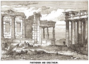 p. 332The state of poor Greece was dreadful. The nobles lived in fortresses upon the rocks, and the monks in their fastnesses; but the villages, towns, and coasts were worse off than ever, for the Turks treated them as rebels, and savagely oppressed and misused them. Nor were they united among themselves, for the families who dwelt in the hills were often at deadly feud with each other; the men shot each other down if they met; and it ended in whole families of men living entirely within their castle walls, and never going out except armed to the teeth on purpose to fight, while all p. 333the business of life was carried on by the women, whom no one on either side attempted to hurt. The beautiful buildings in the cities were going to decay faster than ever, in especial the Parthenon. When it had lost its roof it was of no further use as a storehouse, so it was only looked on as a mine of white marble, and was broken down on all sides. The English Earl of Elgin obtained leave from the Turkish Government to carry away those carvings from it which are now in the British Museum, and only one row of beautiful pillars from the portico of the Temple has been left standing.