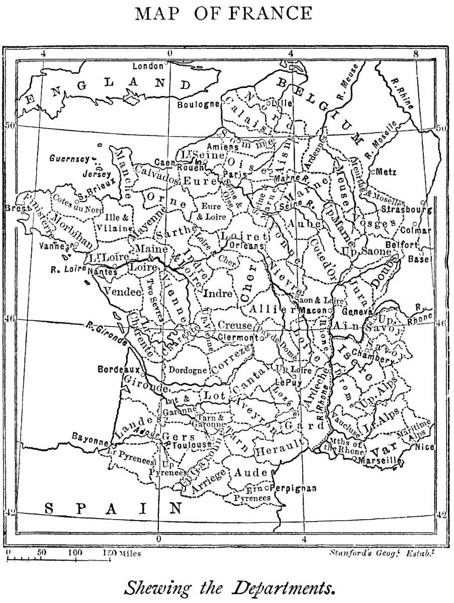 1. France.—The country we now know as France is the tract of land shut in by the British Channel, the Bay of Biscay, the Pyrenees, the Mediterranean, and the Alps. But this country only gained the name of France by degrees. In the earliest days of which we have any account, it was peopled by the Celts, and it was known to the Romans as part of a larger country which bore the name of Gaul. After all of it, save the north-western moorlands, or what we now call Brittany, had been conquered and settled by the Romans, it was overrun by tribes of the great Teutonic race, the same family to which Englishmen belong. Of these tribes, the Goths settled in the provinces to the south; the Burgundians, in the east, around the Jura; whilePg 2 the Franks, coming over the rivers in its unprotected north-eastern corner, and making themselves masters of a far wider territory, broke up into two kingdoms—that of the Eastern Franks in what is now Germany, and that of the Western Franks reaching from the Rhine to the Atlantic. These Franks subdued all the other Teutonic conquerors of Gaul, while they adopted the religion, the language, and some of the civilization of the Romanized Gauls who became their subjects. Under the second Frankish dynasty, the Empire was renewed in the West, where it had been for a time put an end to by these Teutonic invasions, and the then Frankish king, Charles the Great, took his place as Emperor at its head. But in the time of his grandsons the various kingdoms and nations of which the Empire was composed, fell apart again under different descendants of his. One of these, Charles the Bald, was made King of the Western Franks in what was termed the Neustrian, or "not eastern," kingdom, from which the present France has sprung. This kingdom in name covered all the country west of the Upper Meuse, but practically the Neustrian king had little power south of the Loire; and the Celts of Brittany were never included in it.
