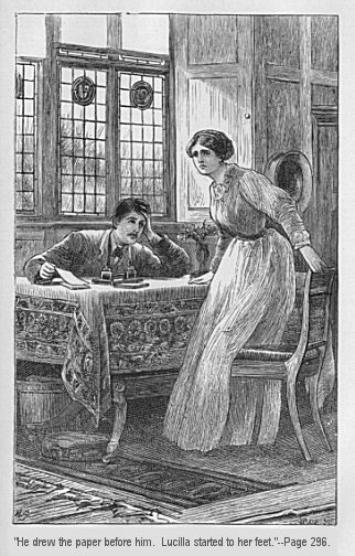 “He drew the paper before him. Lucilla started to her feet.” |