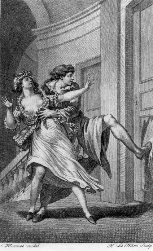 Poor Prévan lost his head, and, fancying an ambush in what was at bottom no more than a joke, he betook himself to his sword. It did him no good, for my valet-de-chambre, who is brave and active, caught him round the body and hurled him to the ground. I was in a mortal fright, I vow. I cried to them to cease, and bade them let his retreat go unmolested, so long as they made [285]certain that he was gone. My men obeyed me: but there was great commotion amongst them; they were indignant that anyone should have dared to fail in respect towards their virtuous mistress. They all accompanied the unfortunate Chevalier, noisily and with the scandal which I desired. Victoire only stayed behind, and we occupied ourselves during this interval in repairing the disorder of my bed.