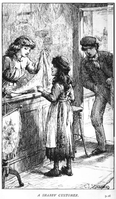 There was, however, very little fault to be found with Florence in business hours; and all went well till about twelve o’clock, when, there being several customers in the shop, Miss Lee became aware of an unusual bustle at one end of it, and beheld Florence opening boxes, spreading out fine pieces of needlework, and showing off plush and silk, with the greatest civility and a perfectly unmoved countenance, to a shabby little girl in an old hat and a dirty apron, while a boy with a basket on his arm stood just inside the door, open-mouthed with rapturous admiration.