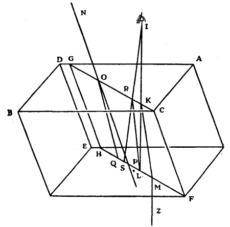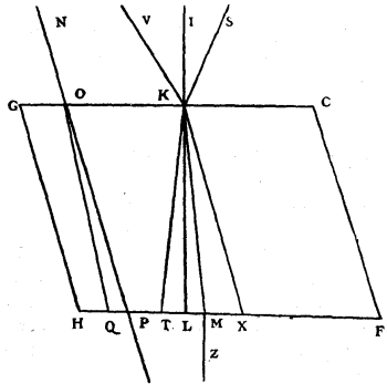 It is certain that the curve EK and all the others described by the evolution of the curve ENC, with different lengths of thread, will cut all the rays HL, GM, FO, etc., at right angles, and in such wise that the parts of them intercepted between two such curves will all be equal; for this follows from what has been demonstrated in our treatise de Motu Pendulorum. Now imagining the incident rays as being infinitely near to one another, if we consider two of them, as RG, TF, and draw GQ perpendicular to RG, and if we suppose the curve FS which intersects GM at P to have been described by evolution from the curve NC, beginning at F, as far as which the thread is supposed to extend, we may assume the small piece FP as a straight line perpendicular [Pg 125]to the ray GM, and similarly the arc GF as a straight line. But GM being the refraction of the ray RG, and FP being perpendicular to it, QF must be to GP as 3 to 2, that is to say in the proportion of the refraction; as was shown above in explaining the discovery of Des Cartes. And the same thing occurs in all the small arcs GH, HA, etc., namely that in the quadrilaterals which enclose them the side parallel to the axis is to the opposite side as 3 to 2. Then also as 3 to 2 will the sum of the one set be to the sum of the other; that is to say, TF to AS, and DE to AK, and BE to SK or DV, supposing V to be the intersection of the curve EK and the ray FO. But, making FB perpendicular to DE, the ratio of 3 to 2 is also that of BE to the semi-diameter of the spherical wave which emanated from the point F while the light outside the transparent body traversed the space BE. Then it appears that this wave will intersect the ray FM at the same point V where it is intersected at right angles by the curve EK, and consequently that the wave will touch this curve. In the same way it can be proved that the same will apply to all the other waves above mentioned, originating at the points G, H, etc.; to wit, that they will touch the curve EK at the moment when the piece D of the wave ED shall have reached E.