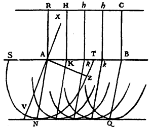 Then AK being an incident ray, and KB its refraction within the medium, it needs must be, according to the law of refraction which was known to Mr. Des Cartes, that the sine of the angle ZKA should be to the sine of the angle HKB as 3 to 2, supposing that this is the proportion of the refraction of glass; or rather, that the sine of the angle KGL should have this same ratio to the sine of the angle GKQ, considering KG, GL, KQ as straight lines because of their smallness. But these sines are the lines KL and GQ, if GK is taken as the radius of the circle. Then LK ought to be to GQ as 3 to 2; and in the same ratio MG to CR, NC to FS, OF to DT. Then also the sum of all the antecedents to all the consequents would be as 3 to 2. Now by prolonging the arc DO until it meets AK at X, KX is the sum of the antecedents. And by prolonging the arc KQ till it meets AD at Y, the sum of [Pg 116]the consequents is DY. Then KX ought to be to DY as 3 to 2. Whence it would appear that the curve KDE was of such a nature that having drawn from some point which had been assumed, such as K, the straight lines KA, KB, the excess by which AK surpasses AD should be to the excess of DB over KB, as 3 to 2. For it can similarly be demonstrated, by taking any other point in the curve, such as G, that the excess of AG over AD, namely VG, is to the excess of BD over DG, namely DP, in this same ratio of 3 to 2. And following this principle Mr. Des Cartes constructed these curves in his Geometric; and he easily recognized that in the case of parallel rays, these curves became Hyperbolas and Ellipses.
